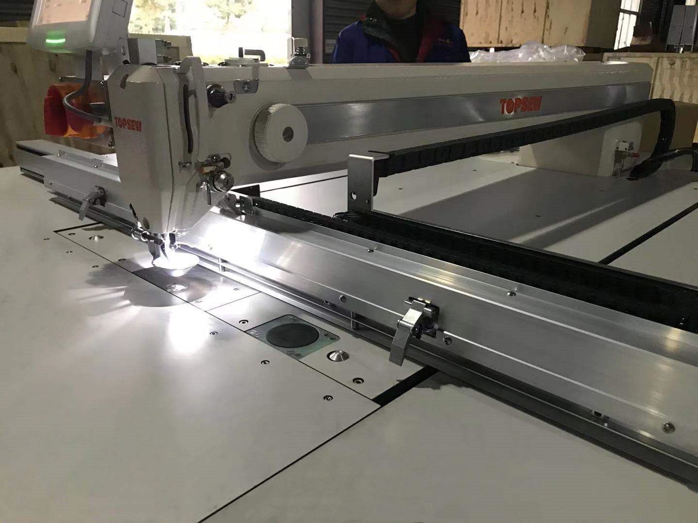 The pattern template sewing machine equipped with flexible Programmable medium pressure foot-driving mechanism, which can effectively reduce maintenance costs and prevent down feather running when sewing down coats. Meanwhile the pattern template sewing machine can change the height of the medium pressure foot according to the thickness of the material for uniform and stable thread-receiving effect.